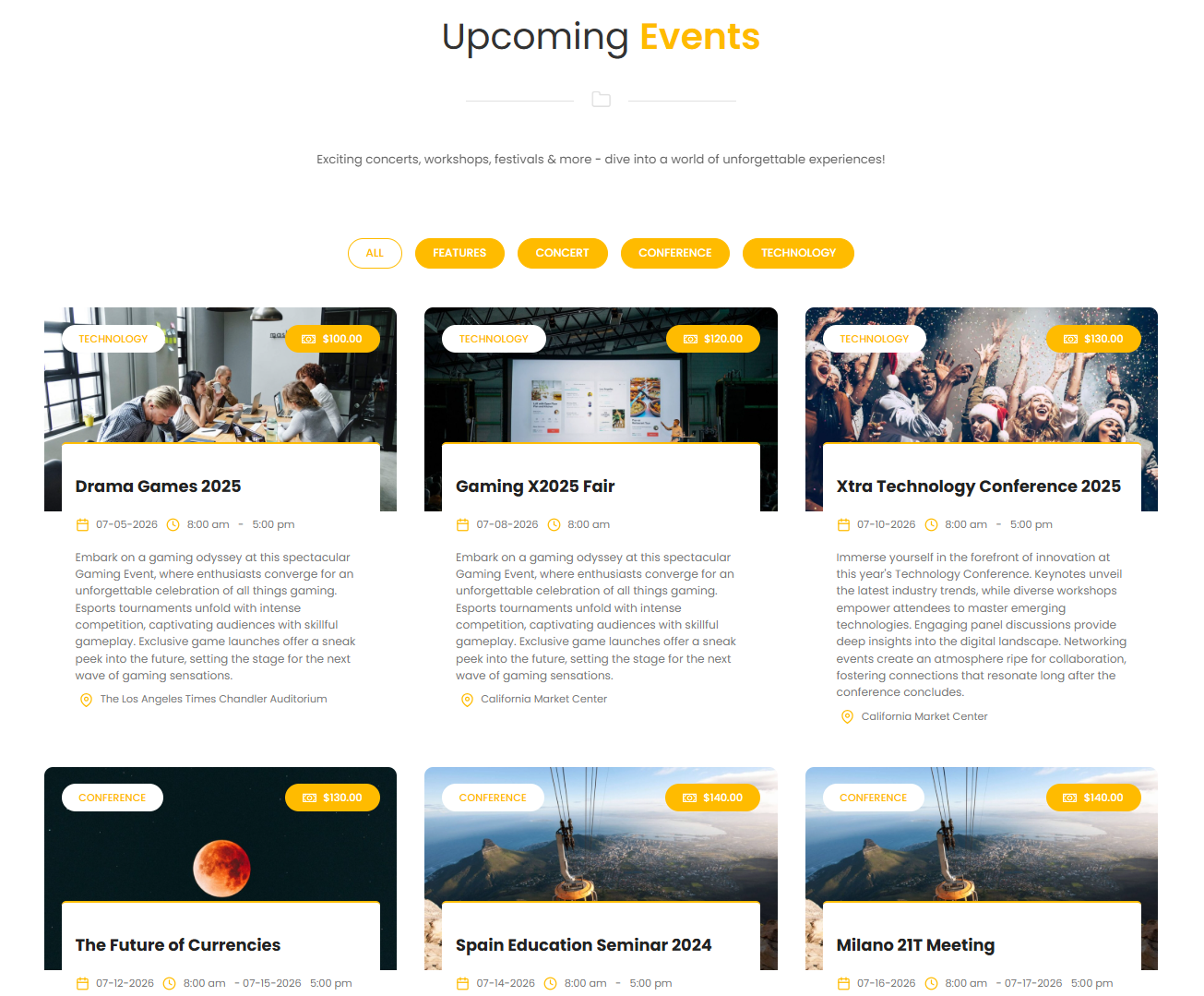 - Home Style 2: Featured Events, Explore Events, Upcomming Events (By Category Tabs), Explore Categories (Sliders)