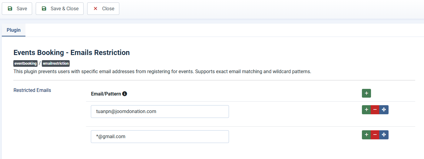 I had it implemented. You can access to My Downloads menu item, download latest package of Events Booking, update it to your site. Then find the plugin Events Booking - Emails Restriction, click on it to edit, setup the email restrictions from there, then enable the plugin and check the result