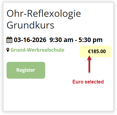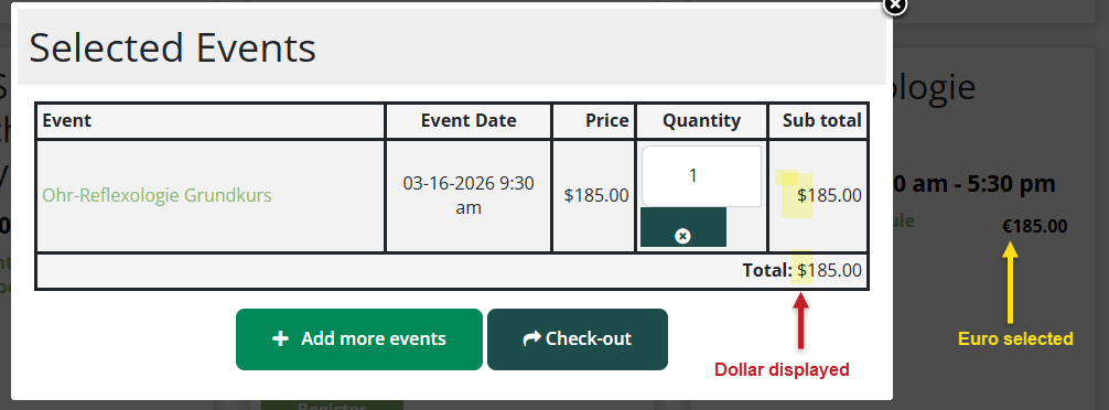 Hi everyone, I've got a client who is based in the USA, but who teaches classes in 3 other countries. I'm glad that I can select to display a different currency for those classes in another country, but when I test it by selecting the event, the US currency symbol (our default) is displayed next to the cost that is actually meant to be in Euros. If there a way to suppress the display of the default currency symbol or display the correctly selected one? I have screen shots to illustrate the issue.