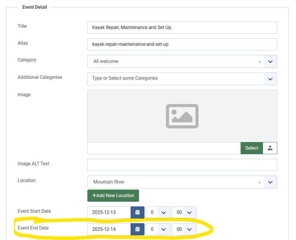 I kind of get why it does this, but for inexperienced users in our club who are just used to entering dates, not times, it would be good if the system could realise that because there is an event end date, the expectation is that it would show as an event date in the second day ... or even if we could set it so the default end time for Even End Date were 23:59 (rather than 0:00) that would be great.