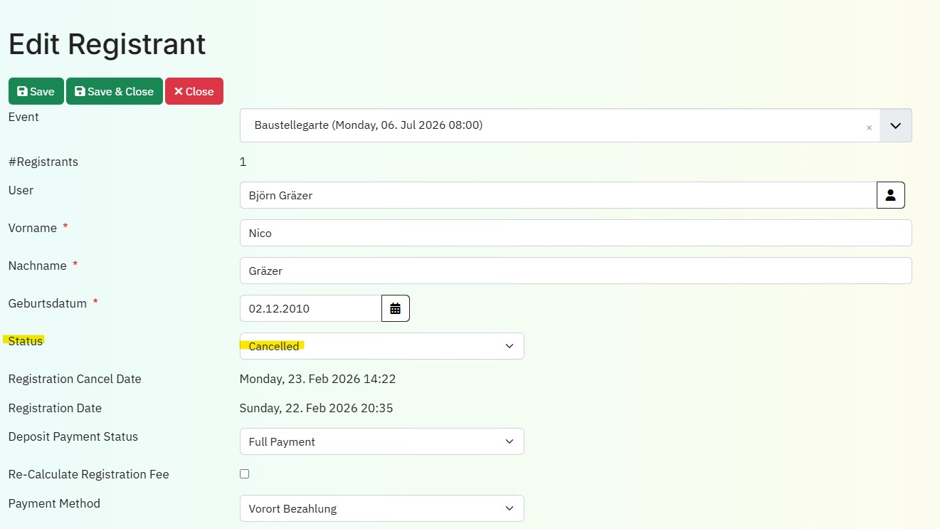 I will think more about this edit registration screen and might disable the option to set status to cancel in next release. Need to think for a good way to handle this