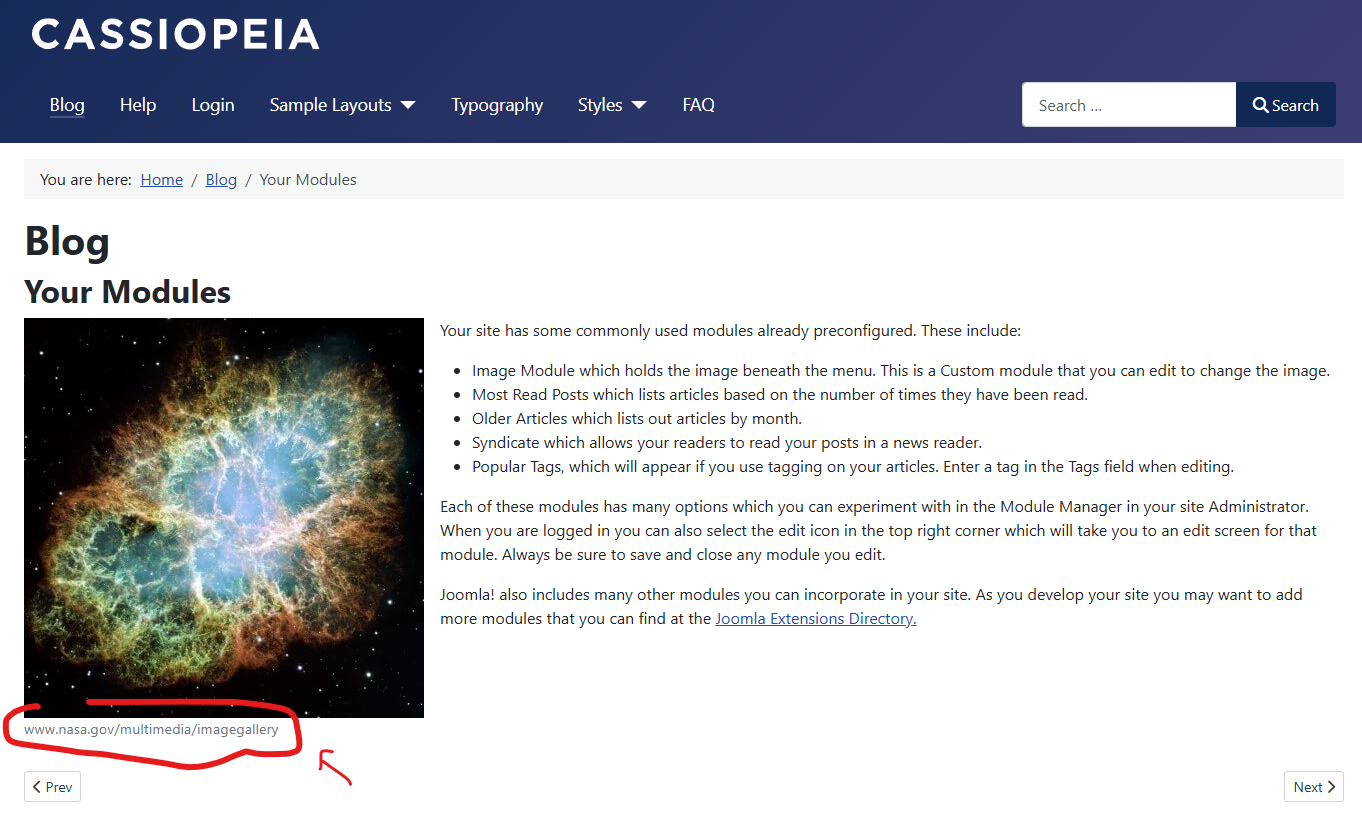 Frontend example of caption display in J5 standard template demo Cassiopeia: