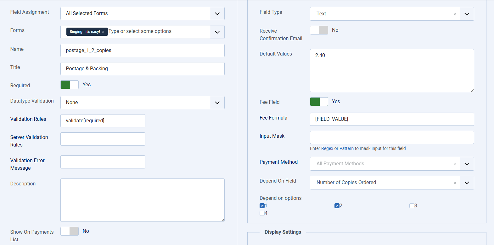 In custom_field2 it automatically enters £2.80 (from depend on) and the user cannot change this figure
