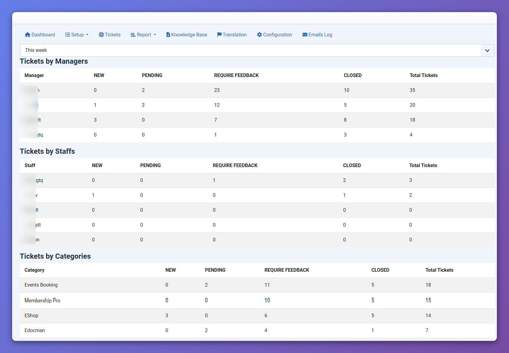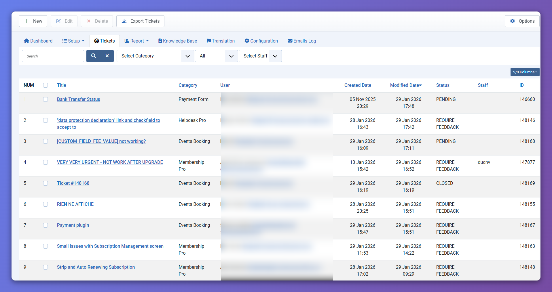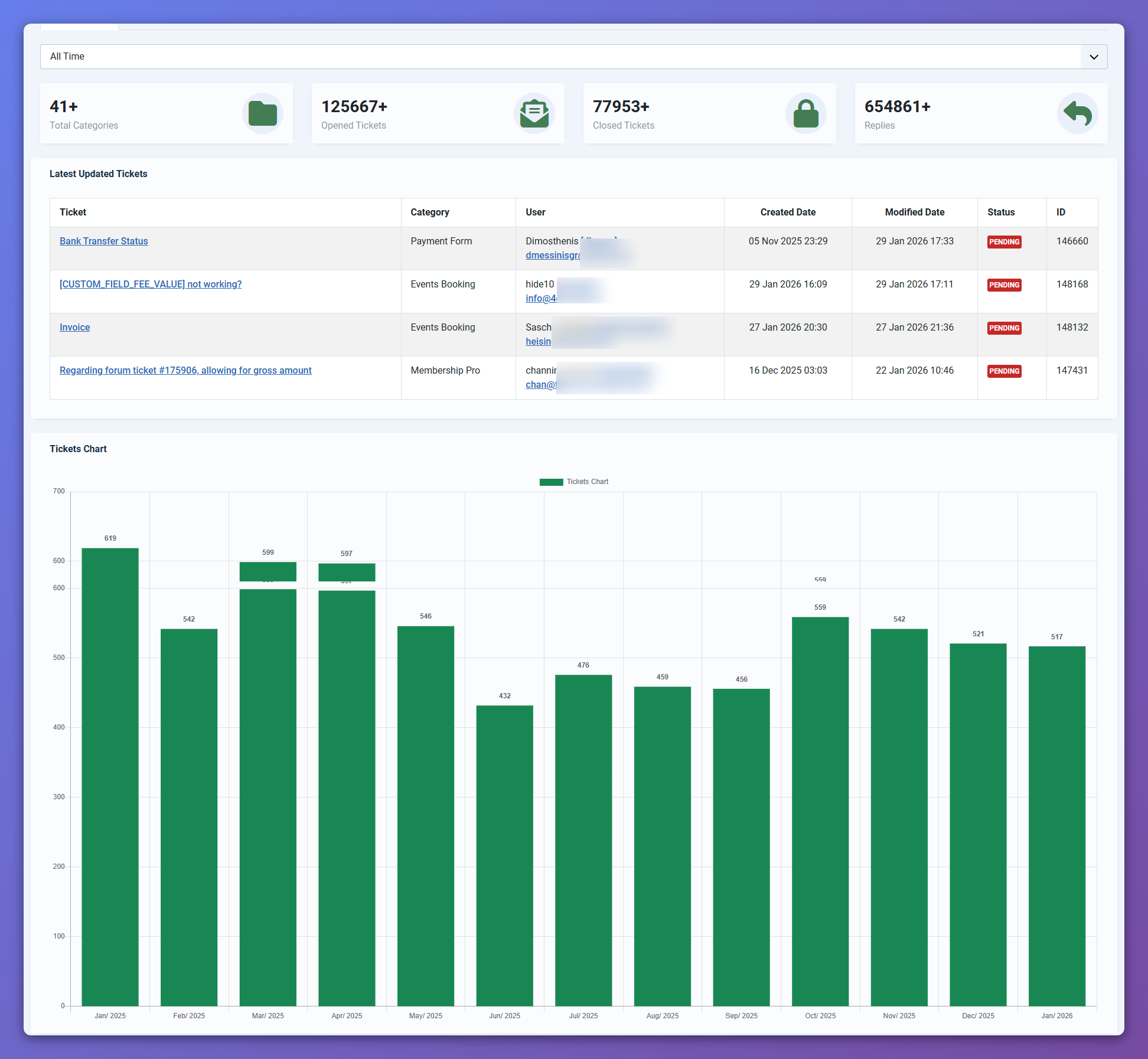 Handle support requests efficiently with comprehensive tools to track, filter, and resolve tickets from frontend or backend.