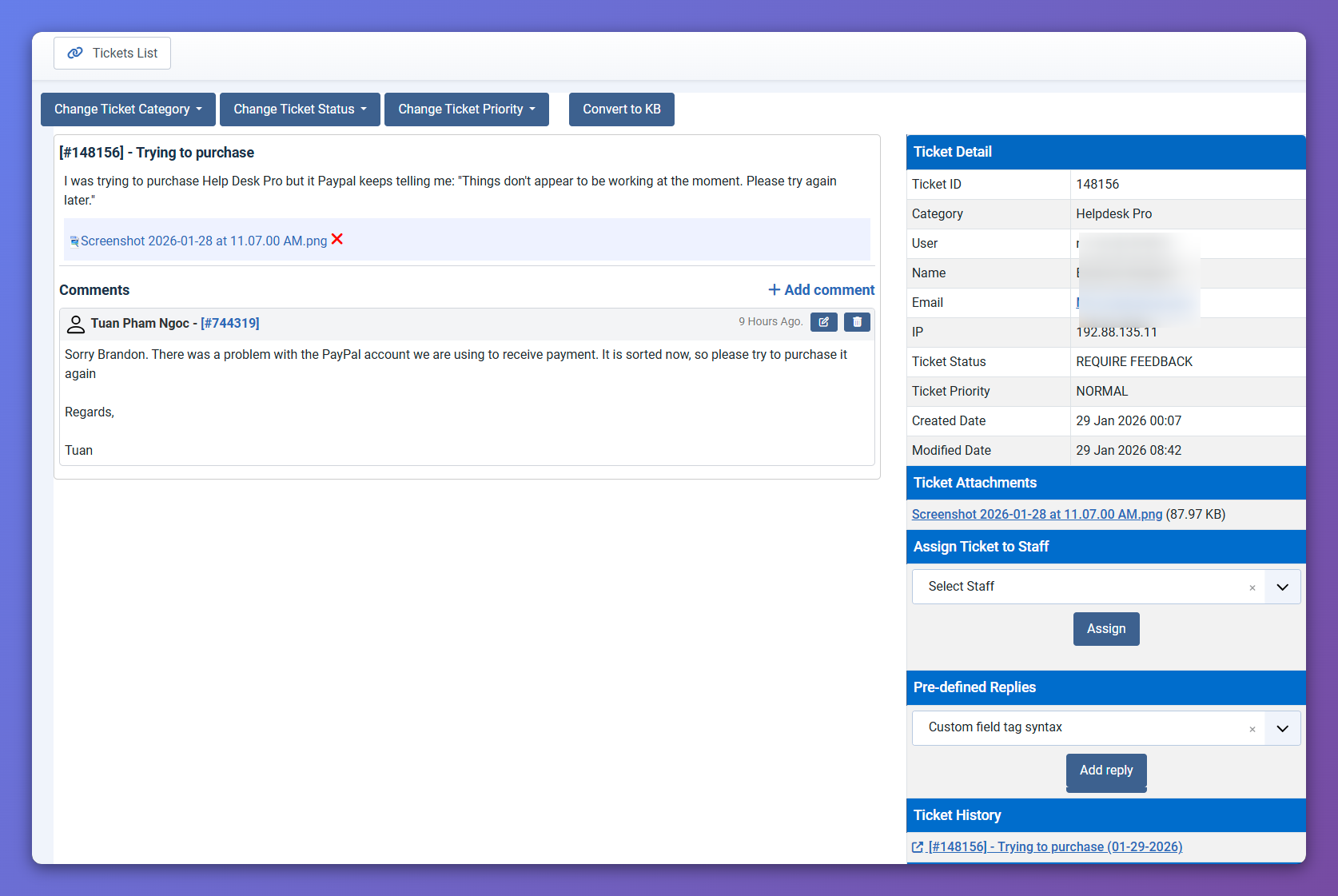 Upload multiple attachments with drag-and-drop support when submitting or replying to tickets.