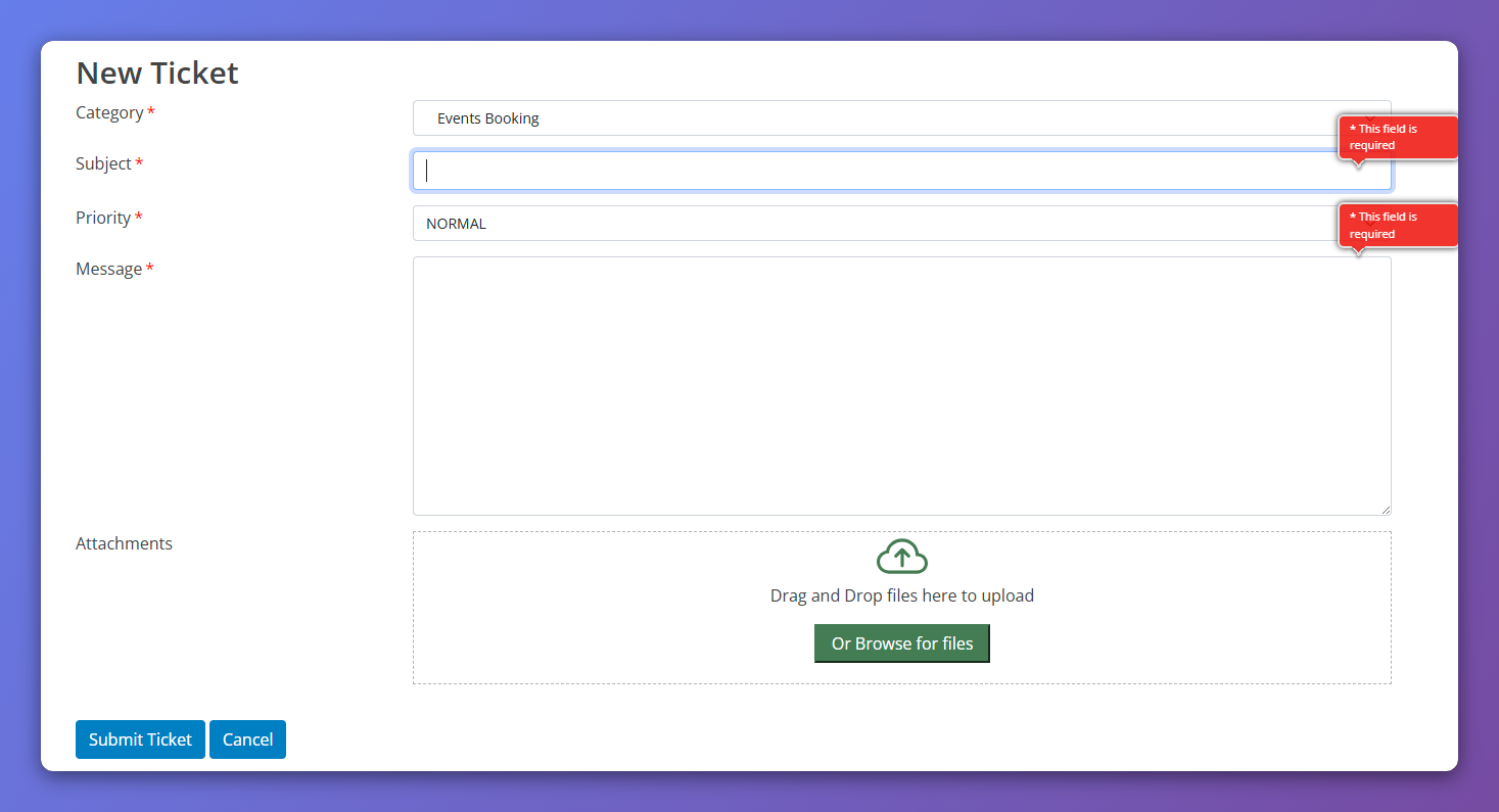 - Customers select a category, enter a subject, describe their issue, and optionally upload attachments